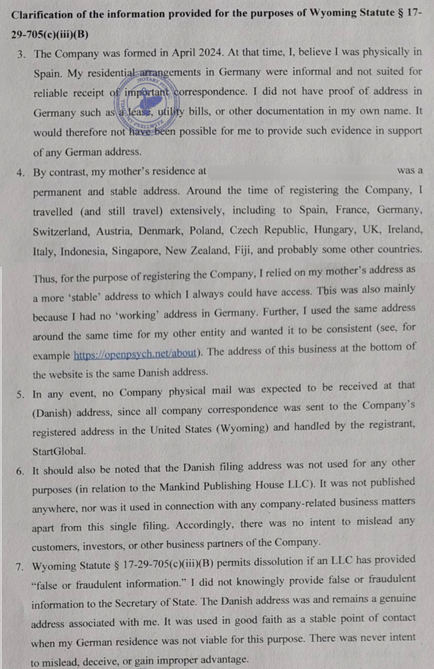 While writing this long post, I got in contact with Erik Ahrens now named Andrew Y who was a former friend and associate of Kirkegaard. As noted above, Ahrens fell out with Kirkegaard; he then published a blog post leaking information about Kirkegaard (such as Kirkegaard’s Human Diversity Foundation74) and his business connection to Mathilda Huss (screenshot). Ahrens confirmed Kirkegaard had lived at (or at least was visiting frequently) the Villa Adlon up to January 2024 but relocated to Spain; he lived in Spain for about five months and afterwards traveled to other countries. Ahrens told me he later moved to Berlin. I managed to confirm this, since Kirkegaard in his sworn affidavit (on 10 October 2025), explicitly stated his address was an apartment in Berlin.