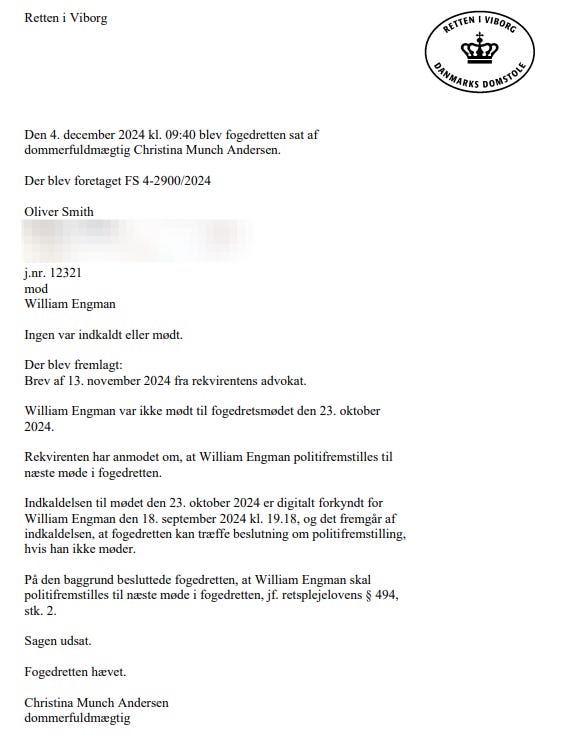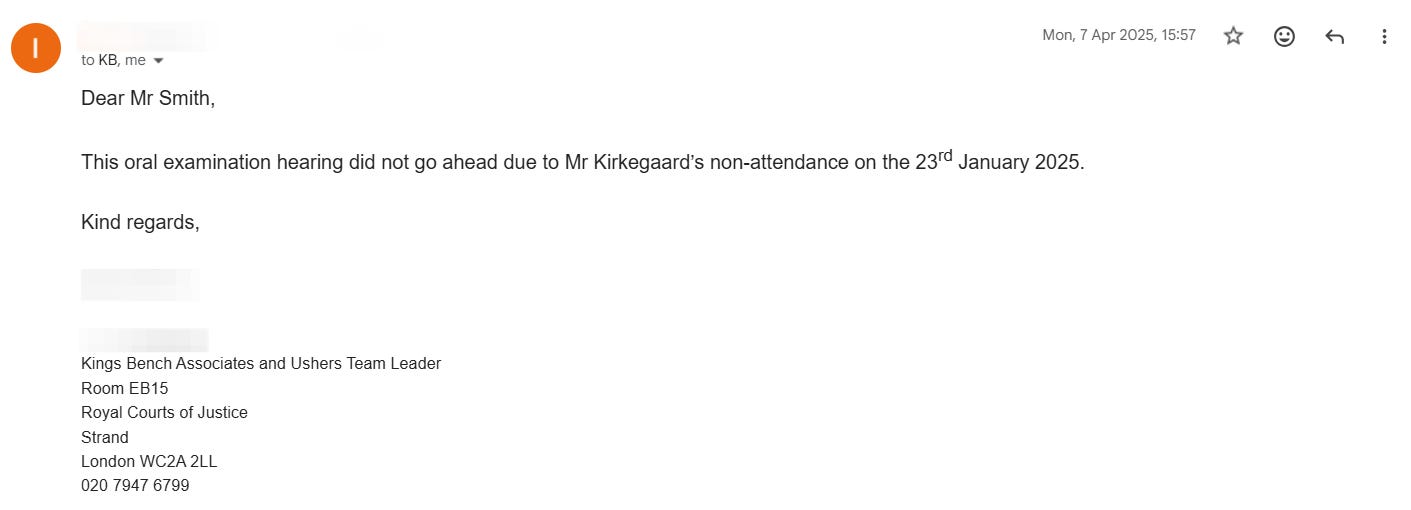 A warrant for his arrest was issued in a bailiff’s court (Fogedretten) in Denmark. It was in effect for several months (since he breached summonses and failed to attend court). His lengthy evasion was likened by a judge at the bailiff’s court to the movie Catch Me If You Can (2002). During proceedings against Kirkegaard in the Court of Appeal, Lord Justice Dingemans summarised his evasion, or noncompliance: “Kirkegaard has made extensive efforts to avoid service” and “taken numerous steps to avoid complying with court orders”.4 He managed to evade police in Denmark (and bailiffs in Germany), but I applied for a suspended committal order against him in England; since he refused to attend the County Court at Central London for debt questioning on 23 January 2025.5