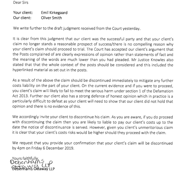 The adjourned preliminary hearing was relisted (before Justice Julian Knowles) on 26 November 2019 and my solicitor had instructed a barrister from 5RB to represent me. Kirkegaard was also represented by a barrister. The hearing went ahead this time and a draft judgment was issued on 3 December 2019 (made public on 11 December 2019). Kirkegaard lost on two of the three issues; Knowles was clear: “I reject the Claimant’s submissions and accept the Defendant’s [Oliver D. Smith’s] submissions” (Kirkegaard v Smith [2019] EWHC 3393 (QB) at [57]). Knowles recognised that my four posts were my opinions (not statements of fact) and three posts were based on hyperlinked material; including sources that paraphrased (or quoted) Kirkegaard’s blog posts on child porn.