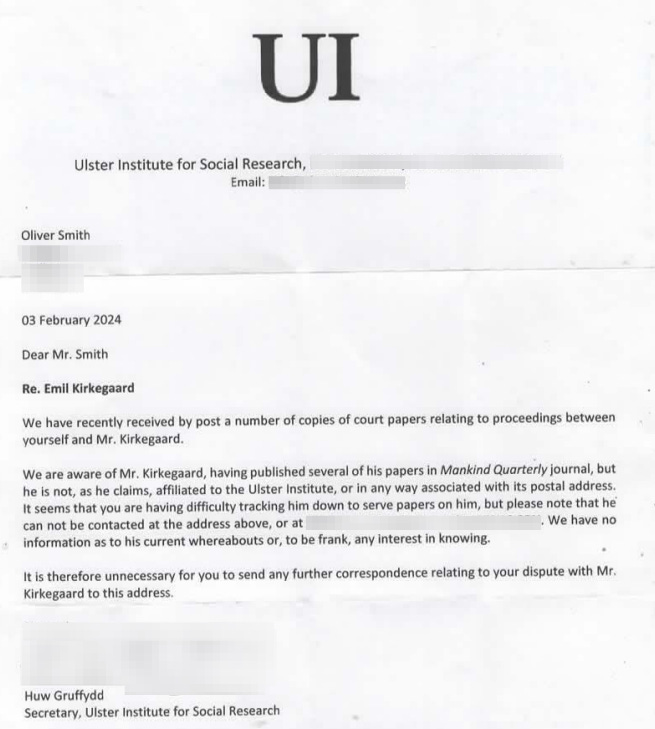 Within two months of doxxed, someone emailed a bogus report to my internet service provider; I received a letter from my ISP stating they had “investigated a report of my internet activities” but were not taking any action because “no crime was committed”. I have little doubt this false report (similar to swatting) was by Kirkegaard. I took legal advice at the time and was told by a solicitor that Kirkegaard had breached my privacy since he posted and misused my private information. This is an actionable civil tort; a claim for damages would also be non-trivial since I had to change ISP to prevent more false reports. As a smokescreen to my potential lawsuit, Kirkegaard legally threatened me, played the victim and accused me of “slandering” him without a shred of evidence.