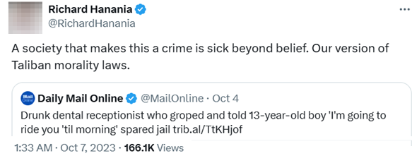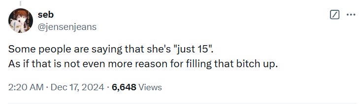 Kirkegaard has never once criticised Sebastian Jensen, for his horrible tweet, in fact, he remains a mutual follower (of his account); and has continued to co-author papers with Jensen at OpenPsych. Kirkegaard himself creepily defends impregnating 15-year olds. In 2023, he wrote a blog post stating that “men’s targeting must be primarily of fecund females” which in his disturbed mind is as young as “age 15”. One year prior, Kirkegaard was accused of “sexualising minors” on social media (for describing a ~16 year old school girl a “fresh fish”). Turning to Hanania, who has appeared on Aporia’s podcast and is occasionally retweeted by Kirkegaard—he has sickeningly defended a 27-year old woman who sexually assaulted a 13-year old boy (by stroking his genitals).