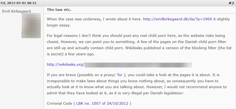 Seeming as Kirkegaard doxxed my ISP and was embroiled in scandals,20 I started to look into his digital footprint. I disturbingly discovered—Kirkegaard once admitted viewing child pornography and wrote comments on the internet, sympathising with legalising the possession of child pornography. In 2013, on a Danish internet forum, Kirkegaard under his real name discussed and linked to a list of illegal websites on a “Danish child porn filter” on Wikileaks (these were websites the Danish government blocked access to). He admitted to viewing these child porn sites (with a Tor browser to hide his Danish IP-address) since he had knowledge the websites “are still up and actually contain child porn” so must have gone through the censored list of websites.