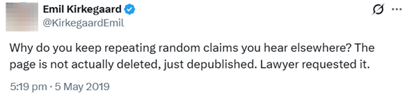 Kirkegaard has had some success in censoring webpages that factually document his internet posts on child pornography or that merely quote his comments; for example, the aforementioned article by DeWereldMorgen that described Kirkegaard a “pedofilie apologeet” (“pedophile apologist”) was removed despite it accurately quoted his posts downplaying the harm of CSA. Kirkegaard suppressed this information in an attempt to get his posts on paedophilia and child pornography memory-holed. He is known to deindex articles from Google (and other search-engines) which mention his comments on child pornography by sending ‘right to be forgotten’ requests. Kirkegaard currently lives in Germany; he can still deindex webpages under EU privacy law (Art. 17 GDPR).