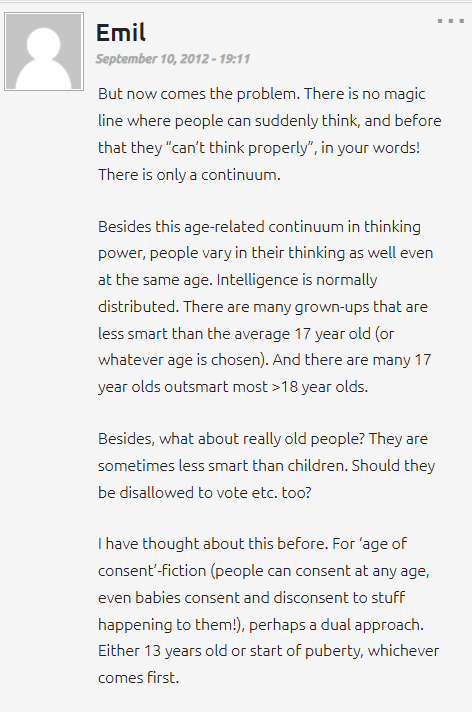 When questioned about his comment in which he supported lowering age of consent to 13 (or the “start of puberty”), Kirkegaard remarked: “We impose semi-arbitrary age cutoffs for various behaviors, driving a car, owning a gun, having sex, buying alcohol. In a 10 year old comment,31 I pointed out that age of consent varies quite a bit across countries, but a natural point could be age of puberty. However, I’m fine with keeping the Danish age of consent to 15”—this comment is an insight into Emil Kirkegaard’s disturbing mind in which he thinks it is ‘natural’ to have sex with pubescent children. He is wrong about this, of course. It is not a “natural point”, to make age of consent at a pubescent age, but postpubescent age (an age when sexual maturation has finished).