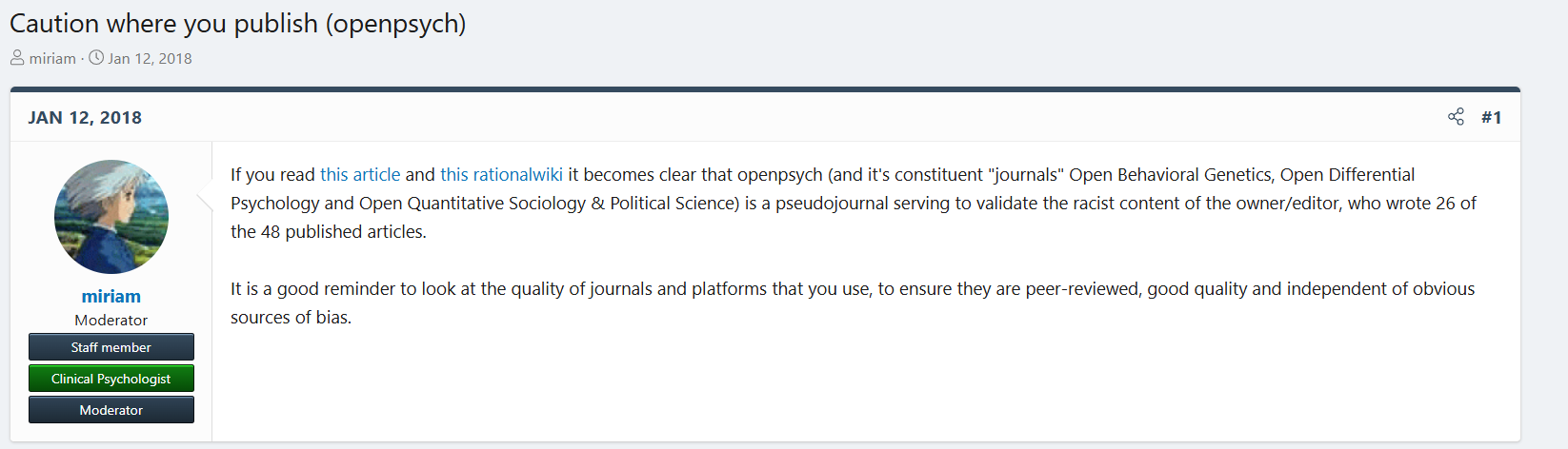 Van der Merwe, 2018 (“a pseudoscience factory”); Bird, 2019 (“The OpenPsych journals have no formal review process”); Panofsky et al. 2020; Giangrande and Turkheimer, 2022 (“Open Behavioral Genetics, and related journals in the OpenPsych network (also created and edited by Kirkegaard) have been dismissed by experts in the field as pseudo-scientific vehicles for scientific racism”); Non and Cerdeña, 2024 (“Pseudoscience journal group OpenPsych”), etc. In fact it has been noted “OpenPsych is used as an example in ethics courses […] which flouts peer-review.” OpenPsych published an editorial to respond to the criticisms (Carl et al. 2018).