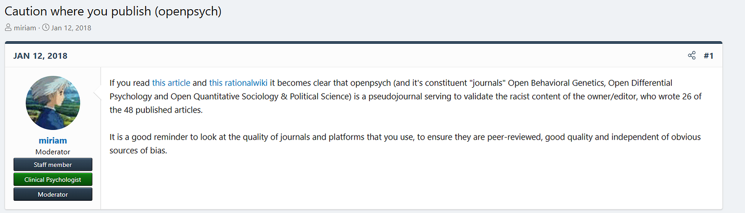 It did not surprise me to learn that other forum posters, before me, complained about “bad experiences at OpenPsych” and some posters even withdrew their manuscripts. I created an article about OpenPsych on RationalWiki to warn people against publishing there largely because of Kirkegaard’s behaviour.12 I am pleased to say this had a lot of success, owing to search engine optimization of the article. For example, a moderator on ClinPsy forum, created a thread cautioning about OpenPsych and the journals have never been indexed in bibliometric databases because they are blacklisted. Amusingly, Davide Piffer (who set up OpenPsych with Kirkegaard) promotes the psychic fraud Uri Geller and delusionally himself believes he has a type of “extra-sensory perception”.13
