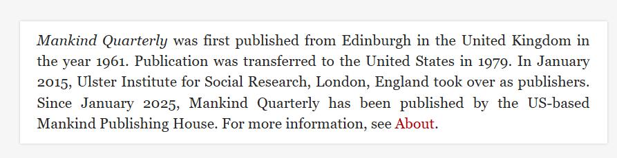 Aporia is owned by Emil Kirkegaard (it was previously named Ideas Sleep Furiously) and now edited by Noah Carl and Bo Winegard; curiously, its former editor-in-chief Matthew Archer (Frost) contacted me and requested I publish an article on cryptozoology for Aporia and said he would host a debate between myself and Michael Woodley since we both have published peer-reviewed papers on cryptids. I turned down this offer and I do not want anything to do with Aporia. Adam Rutherford was similarly approached by Archer and he rejected his offer.