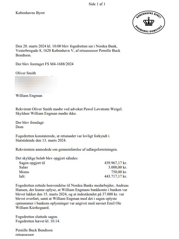 Kirkegaard did not have an address (for mail) in Denmark so I was granted permission to serve the bailiff requisition to him by email and service by publication. The bailiff’s court was at the Copenhagen City Court (Københavns Byret). Nordea Bank Danmark’s headquarters are also located in Copenhagen. Emil Kirkegaard on 13 March 2024, was served a summons (by publication) in the government gazette Statstidende (screenshot). He was summoned to attend a hearing (concerning my bailiff requisition) on 20 March 2024. Within two days of the summons being issued—Kirkegaard transferred his bank savings (37,000 DKK = £4,240) and closed his account. He refused to attend the hearing and breached the summons. He had transferred his savings before I could freeze them.