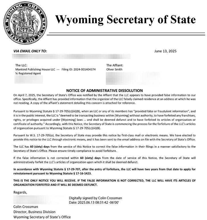 Finally, I have received confirmation that Kirkegaard is breaching rules in the German Commercial Register (Handelsregister). Kirkegaard deregistered from the Kiel address I initiated enforcement against, years ago, but he never removed this same address from the commercial register; at the District Court of Kiel (Amtsgericht Kiel). This explains how I was able to serve him via service by publication on a court noticeboard. There is an obligation for managing directors of companies in Germany to keep their company address up to date on the German Commercial Register. Failure can result in a fine of €5,000 under the German Commercial Code (Book 1, Division 2, s. 14) and/or company dissolution for long-term negligence. To date, Kirkegaard has not updated his address.