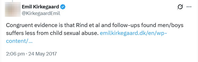 Bailey is a supporter of the infamous meta-analysis (on CSA) by Rind et al. (1998). This controversial paper has been widely criticised for downplaying psychological harm of child sexual abuse and it used a “flawed methodology” (Whittenburg et al. 2001). In the past, Kirkegaard has defended Rind et al., for example, in 2017, he questionably argued there is “congruent evidence […] boys suffer less from child sexual abuse” than girls. In other tweets, he continued to downplay the psychological harm of CSA, believing that it does not have long-term psychological effects. DeWereldMorgen therefore published an article calling Kirkegaard a “pedofilie apologeet” (“pedophile apologist”) compiling his online posts supportive of Rind et al., and downplaying harm of child sexual abuse.