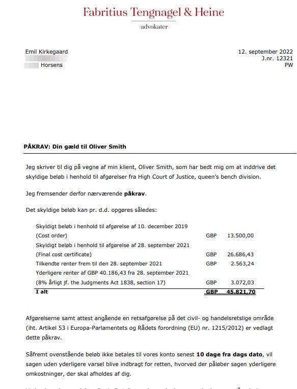 In January 2022, I initiated enforcement proceedings against Kirkegaard in Denmark and also began drafting contempt proceedings in the High Court of Justice for a false address on his claim form. However, before I could file the latter I needed proof. This led me to hire a private investigator (CIS Gruppen) and an attorney who specialises in debt recovery in Denmark (Fabritius Tengnagel & Heine). Kirkegaard was easy to skip-trace since although evading and failing to pay the judgment debt his WHOIS domain records for his own website (emilkirkegaard.dk) were publicly accessible. As a domain registrant, he voluntarily made his registration details (including his address) publicly accessible and I therefore bought a domain report for his website from DomainTools.