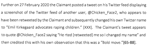 I disagreed with Kirkegaard on all these core issues. Kirkegaard pleaded my four posts were “statements of fact” that meant he is a “sexual abuser of children” and they were defamatory at English common law. In sharp contrast, I argued they were my opinion; that meant he is a “paedophilia apologist” and doubted if they were defamation under common law which should not be confused with the statutory Defamation Act 2013.46 For a statement to be libel there are two hurdles to pass: common law and statute law. The former threshold is lower-bar,47 than the statutory requirement of “serious harm” (damage to reputation). However, the hearing on preliminary issues was not to decide if my four posts damaged Kirkegaard’s reputation since that was to be decided at trial.