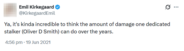 On 12 February 2024, I filed a harassment claim in the High Court of Justice under the Protection from Harassment Act 1997 (Section 3). As I earlier mentioned, I did not file a counterclaim against Kirkegaard in Kirkegaard v Smith (QB-2018-000390) so later filed a civil claim of harassment Smith v Kirkegaard (KB-2024-000772). My claim for damages was for £1,000 and I requested declaratory relief.73 The primary basis of my claim was Kirkegaard described me as a “stalker” in tweets and blog posts (examples: screenshot, screenshot and screenshot [see below]). I have never “stalked” Emil Kirkegaard; this is an unfounded and malicious accusation. I did skip-trace, as well as hired a few private investigators but this was all justifiably done as a creditor to recover the debt he owed.