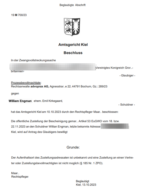 After a delay in the proceedings because I had to obtain permission from the Regional Court of Kiel (Landgericht Kiel) since the debt exceeded €5,000—the District Court of Kiel (Amtsgericht Kiel) approved my enforcement application and on 10 October 2023, the publication was put on a noticeboard inside the courthouse. After service, I looked at the possibility of garnishment of company shares and I managed to obtain a seizure order (Pfändungsbeschluss). I was though advised against seizing company assets (since Kirkegaard’s share capital was under €500). This meant enforcement action was a dead end in Germany. I did not know where Kirkegaard secretly moved to; I could not apply for a garnishment of his savings because I did not know his bank account in Germany.