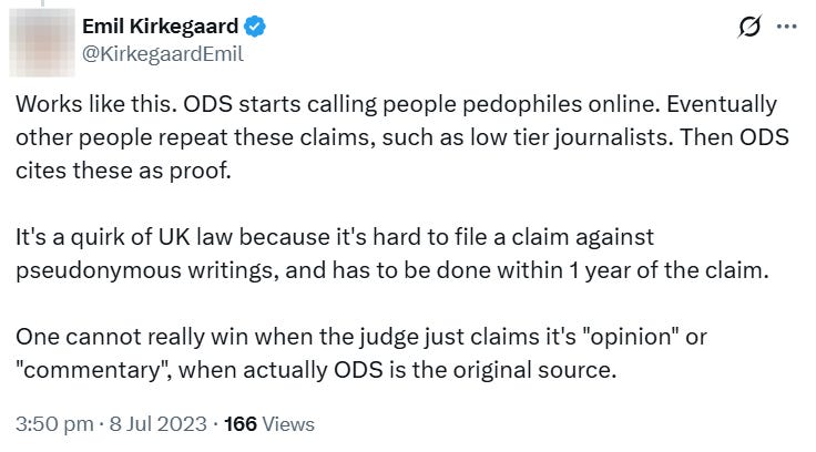 On social media, Kirkegaard has repeatedly lied about my legal defence and made up a false narrative: “One cannot really win when the judge just claims it’s [an] ‘opinion’ or ‘commentary’, when actually ODS is the original source.” Of course, this is nonsense. I was not the “original source” of my honestly held opinions. My opinions were and still are based on Emil Kirkegaard’s blog posts and comments; it was him, who said that he wants to legalise child pornography, admitted to accessing it, and supports abolishing age of consent or reducing it to 13-years old or younger. It was his unpleasant writings I read that I based my opinion he is a paedophilia apologist; my view has not changed. In contrast, Kirkegaard has being ludicrously claiming that I was the “original source”.
