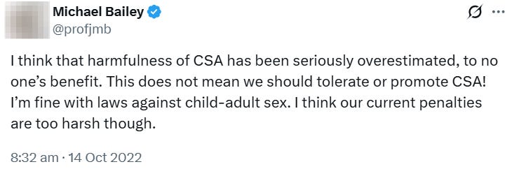 More concerning about Aporia is its association with J. Michael Bailey who has made several controversial tweets on paedophilia. Bailey has bizarrely claimed “everyone is attracted to minors”, denies Jeffrey Epstein was a paedophile (even though he pleaded guilty to soliciting a minor for prostitution and was further indicted on charges of sex trafficking minors as young as 14) and has even defended Epstein by stating “Epstein’s evil has been hugely exaggerated.” With tweets such as these, it is unsurprising Bailey himself has been accused of defending paedophiles or downplaying the harm of child sexual abuse. For example, Bailey has stated that he believes child sexual abuse (CSA) has “been seriously overestimated”. He also thinks penalties against it are “too harsh”.
