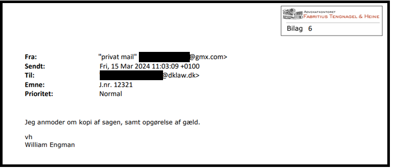 Immediately before transferring his bank savings and closing his account, Kirkegaard contacted my Danish attorney by email, to request a copy of the enforcement case and a statement of the debt owed. My attorney provided this information. Kirkegaard used an email account from GMX Mail (a German webmail service). Years later, Kirkegaard lied in a witness statement (see below), to deny sending this email. The reason for this deception later became clear: Kirkegaard preposterously maintained that he never had been served any legal documents and had no knowledge at all of enforcement as a new evasion strategy. This contradicted his contact with my attorney by email, so he began denying he sent the above email and claimed he has “never responded” to my attorney.