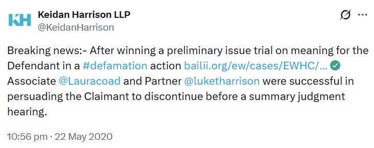My tweet was also deleted as part of the larger deleted thread; Kirkegaard put no effort into providing analytical data about its extent of publication. The significance of having to show analytical data for tweets was highlighted in Chandler v O'Connor [2019] EWHC 3181 (QB) at [21]. It was not possible for my single tweet to have damaged Kirkegaard’s reputation; it was clicked on, or read by very few people (it had zero retweets). The publication was so limited, I had grounds to strike it out under ‘Jameel’ abuse of process since costs of the proceedings (tens of thousands) were disproportionate to the benefit of potential reputation vindication.