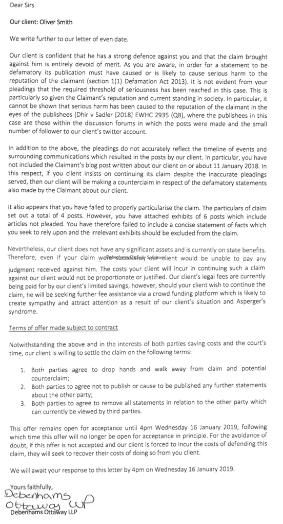 Unfortunately, in the UK there is very little one can do to prevent or quickly throw out a frivolous libel lawsuit. There are options under CPR 3.4(2) to strike out a “statement of case”,34 as an “abuse of the court’s process” or “the claimant has failed to show that it is more likely than not the claim would succeed” (this requires an application and a hearing since the High Court of Justice will rarely strike out a statement of case on its own initiative). Kirkegaard filed his defamation claim against me on 7 December 2018. It was his first claim, so I could not apply for a limited civil restraint order (PD 3C 2.1) which requires at least two claims “totally without merit”.35 I hired a solicitor,36 who sent a letter to Kirkegaard, which noted the libel claim was “entirely devoid of merit”.