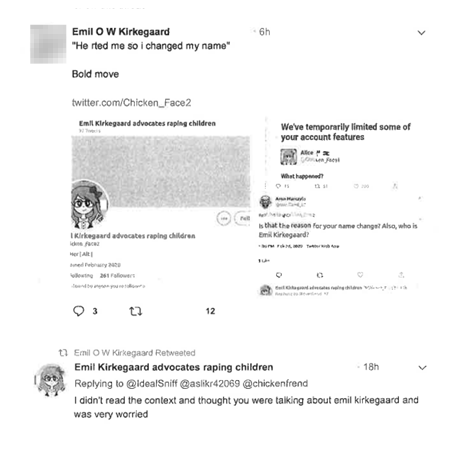 In a blog post in July 2022, Kirkegaard erroneously claimed I quoted his posts on child pornography out of context. Not only is this untrue but the exact opposite of the truth. Kirkegaard from the beginning of his frivolous lawsuit misconstrued my posts. I never took anything he wrote out of context—that is what he did to me. He was criticised in the preliminary judgment for doing exactly this (Kirkegaard v Smith [2019] EWHC 3393 (QB) at [63]). He submitted incorrect meanings of my four posts (the judge in contrast, agreed with my meanings) and quoted them out of context by ignoring the hyperlinks. Kirkegaard tells so many lies and has such a distorted sense of reality, he often inverts the truth; there is not much point in trying to reason with someone with this mindset.