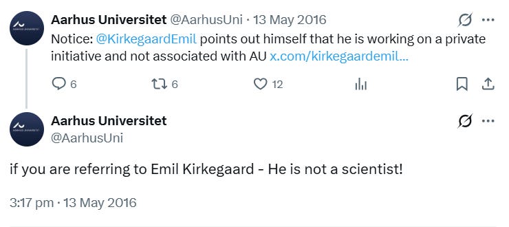 The doxxing incident brought the university he was studying a Master’s degree at the time (Aaarhus University) into disrepute, but they did not expel him. Nevertheless, he dropped out a few months after the controversy.15 He faced a copyright infringement claim since he uploaded OkCupid’s data (without permission) on to the Open Science Framework. His alma mater has published various statements on their official Twitter account clarifying OpenPsych has nothing to do with the university, the upload to OSF was Kirkegaard’s “own initiative” and embarrassingly for him he was “not a scientist”. They further criticised Kirkegaard for exaggerating his curriculum vitae in May 2016; Kirkegaard said his employment was “mostly a scientist” when he was unemployed.16