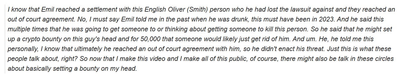 I consider Ahrens to be a reliable source of information concerning Kirkegaard (since most of his claims I have independently verified). Ahrens for months, had stayed with Kirkegaard at a house in Spain. Furthermore, he was formerly involved in setting up a company with Kirkegaard’s girlfriend (Liegent LLC) and was a close friend. According to Ahrens, Kirkegaard often discussed his dislike of me with him and openly admitted he was evading my enforcement proceedings. What Kirkegaard told Ahrens in private contradicted what he wrote in court witness statements, which sums up his dishonest character. Most concerning is Ahrens told me Kirkegaard planned in early 2024, to kill me by hiring a hitman on the dark web (as a way to stop paying me the judgment debt).