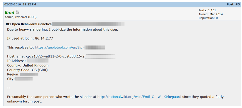 I first heard of Emil Kirkegaard’s name in April 2015 when someone told me he had founded with Davide Piffer the previous year open-access journals: Open Differential Psychology, Open Behavioral Genetics, Open Quantitative Sociology and Political Science.7 At the time, I was writing a manuscript on the psychology of UFO reports8 and was looking for a peer-review journal to publish my paper in. I joined OpenPsych’s forum (user: Krom) but quickly realised that OpenPsych was not what it purported to be and its journal’s review process is flawed.9 OpenPsych does not rigorously peer review its papers, contrary to what Kirkegaard claims but he ignored my criticisms and banned my account on 25 February 2016.10 He doxxed my IP, ISP, email, and geo-location.11