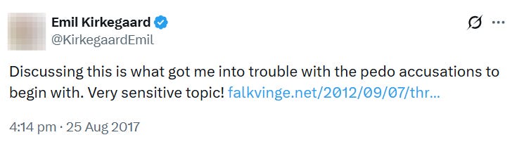 Kirkegaard was able to hide his blog posts but not comments he wrote on Falkvinge’s blog; this left him over the years, with making up excuses. In regard to his comments that supported legalising child pornography he now tried to justify them by claiming he opposes “internet censorship” from “big tech” or capitalists and that he supported decriminalising possession of child pornography on the grounds of liberty. In regards to his support for reducing age of consent, he suddenly said he changed his mind and now opposes lowering the age of consent, claiming: “I don’t advocate any changes to age of consent laws” (contradicting his earlier comments). People can and do change their minds on things but I found the timing to be suspicious and doubt his sincerity.
